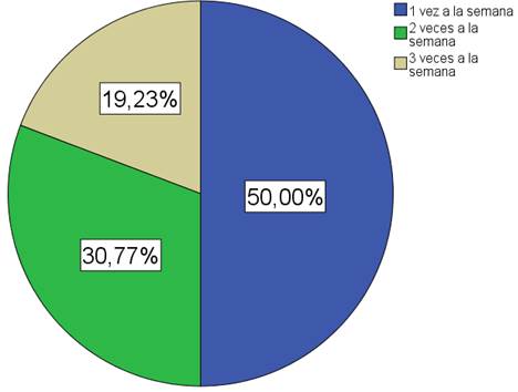 En la Figura 4 se puede observar que el 50 % afirmó que venden sus productos en el centro de la ciudad una vez a la semana, el 30,77 % dos veces por semana y el 19,23 % tres veces por semana.