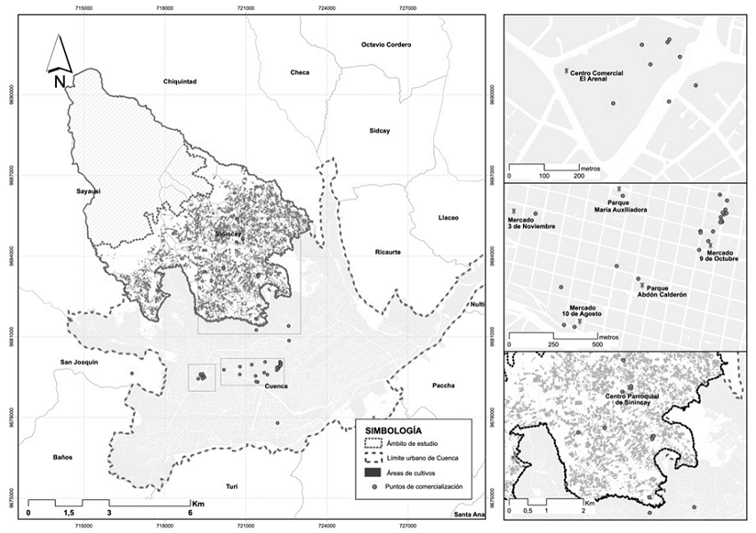 La Figura 5 ilustra los sitios de mayor concentración del comercio informal en la ciudad de Cuenca: mercado 9 de Octubre, mercado 10 de Agosto, parque Abdón Calderón, mercado 3 de Noviembre y parque María Auxiliadora. Por su parte, en Sinicay la venta informal se concentra en el centro comercial El Arenal y en el parque central de la parroquia.