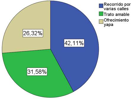 La Figura 6 muestra, además, que el 31,58 % de las mujeres encuestadas afirmó que generar un trato amable de vendedor al cliente facilita una mejor venta. Un 26,32 % respondieron que un ofrecimiento de yapa es una de las mejores maneras de poder vender sus productos en mayor cantidad. La yapa, según el Diccionario de la lengua española (2022). es una palabra quechua que significa aumento o ayuda.