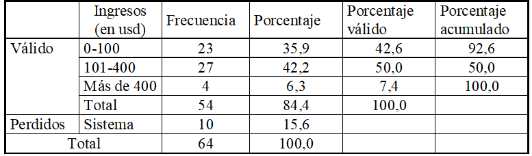 Según los resultados mostrados en la Tabla 2, el 42,2 % generó un ingreso mensual entre los 101 y 400 dólares, dato que coincide con los de (Quispe et. al., 2020) en un estudio realizado en Riobamba, ciudad del centro de la sierra ecuatoriana. Por otra parte, el 35,9 % gana hasta $100 y tan solo el 6,3 % por encima de $400.