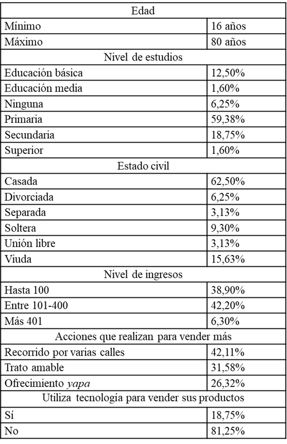 A partir de los resultados se desarrolló un perfil de las mujeres comerciantes informales de la parroquia Sinincay, cantón Cuenca. En este se reflejan los aspectos principales que las caracterizan al momento de vender sus productos: la edad promedio (50 años), sus niveles de estudio culminan en la primaria, el estado civil en el que se encuentran la mayoría es casadas y el nivel de ingreso por concepto de comercio informal es de $100 hasta $400 mensuales. En tanto, su creatividad al momento de lograr una mayor venta recae en las estrategias de recorrer varias calles, brindar un trato amable y ofrecer yapa. Por último, un escaso porcentaje de las mujeres comerciantes informales utiliza la tecnología como medio para la comercialización de sus productos.