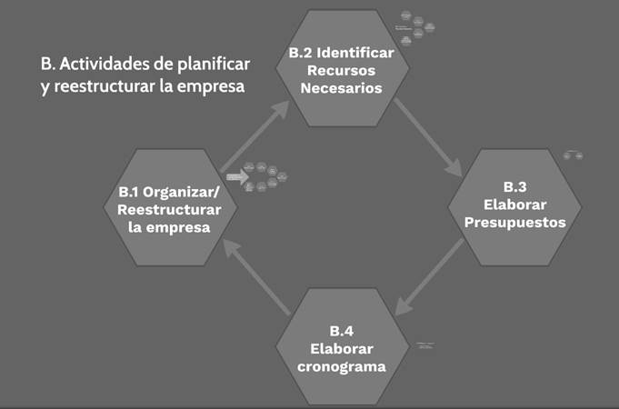 La etapa B Planificar y reestructurar la empresa, consta de cuatro actividades, identificadas con las letras B.1 a la B.4, según se muestra en la figura siguiente.