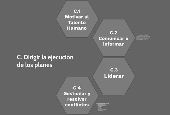 Como tercera etapa (C) se plantea dirigir la ejecución de las estrategias y de los planes aprobados, para lo cual deben aplicarse técnicas e instrumentos para la correcta atención de los diferentes componentes de la gestión del talento humano; entre ellos: la motivación, el liderazgo, la comunicación y la solución de conflictos.