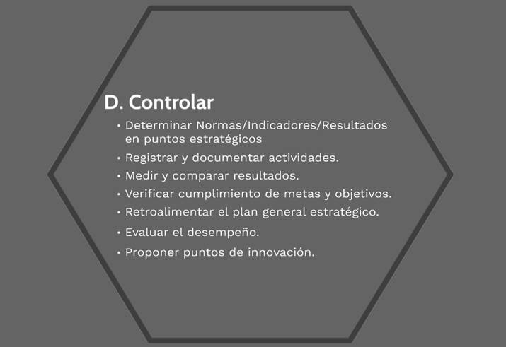 La cuarta etapa (D) tiene el objetivo de garantizar el seguimiento y tomar las medidas correctivas que procedan para el cumplimiento exitoso de las estrategias, planes, normas y sistemas establecidos y evaluar periódicamente los resultados que se vayan logrando.