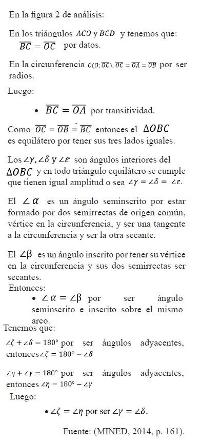 Al escoger el criterio se reduce el problema a demostrar la igualdad entre dos ángulos que al ser representados en la figura 2 de análisis encuentran la justificación. La representación en la figura 2 de análisis es un elemento fundamental en el proceso de solución del problema.
