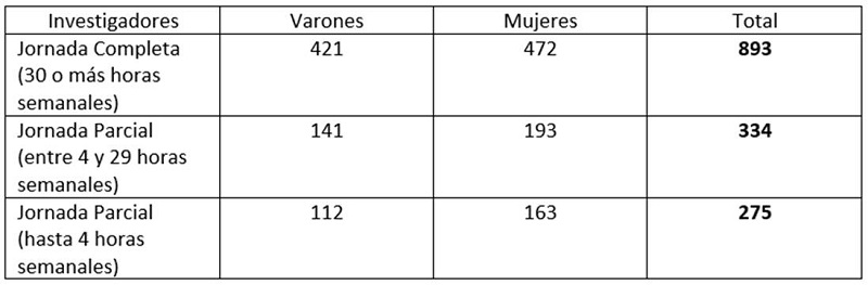 Todo ello fue reconfigurando el trabajo de docencia e investigación y sus articulaciones e impactó no solo a nivel nacional, sino al interior de cada una de las universidades nacionales. Según datos de 2019 elaborados por la Universidad Nacional del Litoral para el Ministerio de Ciencia, Tecnología e Innovación Productiva en el marco del Relevamiento Anual de Actividades Científicas y Tecnológicas, la UNL contaba con un total de 1502 docentes investigadores con diferentes dedicaciones: completa (30 o más horas), parcial entre 4 y 29 horas y parcial hasta 4 horas semanales, como se observa en la siguiente tabla: