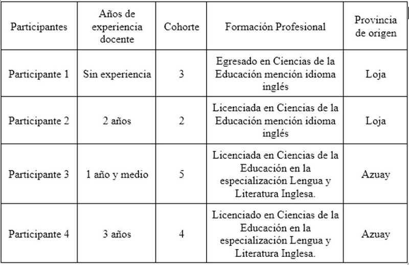 De este modo, los datos del presente estudio son los relatos escritos de cuatro docentes ecuatorianos de inglés, quienes desempeñan su labor como docentes de lengua extranjera y fueron becarios del programa de capacitación Enseña Inglés. Se optó por trabajar con cuatro docentes, siguiendo la sugerencia de Creswell (2009), quien recomienda que en un diseño de investigación biográfico-narrativo se reduzca el número de participantes para favorecer la calidad y profundidad del análisis. Por lo tanto, se utilizó un muestreo no probabilístico intencional.