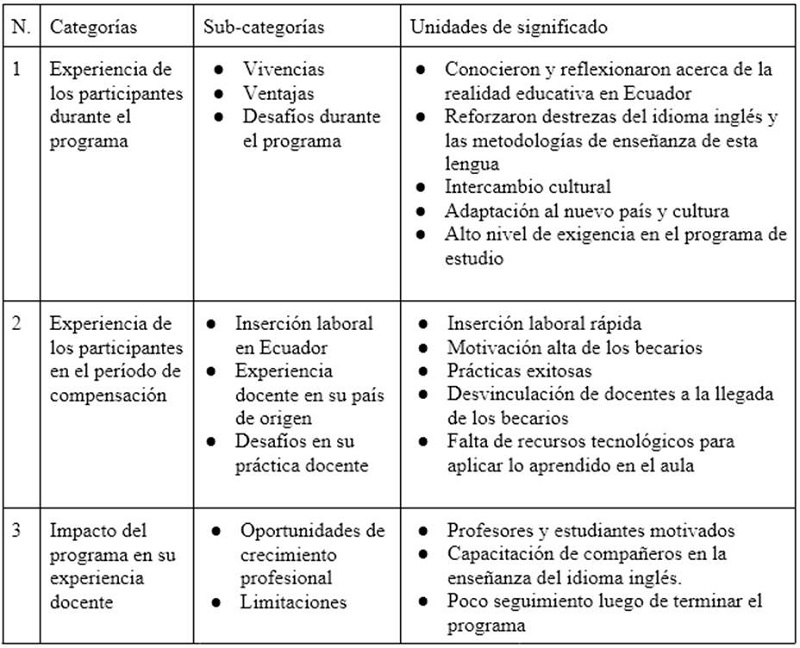 Basándonos en esto, se utilizó el método deductivo para organizar la información en tres categorías principales. Estas categorías describen la experiencia de los participantes durante el programa, en su período de compensación y el impacto que tuvo este en su práctica docente una vez regresados al país. En la Tabla 2 se presenta con detalle la categorización de estos resultados.