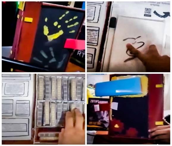 Los materiales implementados para la creación de este libro-arte en forma de biblioteca fueron, en su mayoría, reciclados. No obstante, con un poco de creatividad dieron un resultado lúdico e interactivo. Así, cajas de cartón, fomix, papel, sobres, hojas, cinta, pintura, entre otros, fueron algunos de los elementos que dieron vida al trabajo.