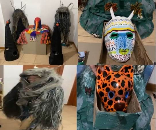 Estas tres figuras cuidan un volcán que se erige como el centro de toda la muestra artística y que, a su vez, resguarda otras piezas simbólicas características en las festividades de esta cultura ancestral. En este caso se realizaron máscaras de cuatro personajes típicos: el wiki, personaje de carácter bufonesco; el oso, deidad local que obra para que se respeten las tradiciones del pueblo; el tigre, que desempeña las nobles tareas de vigilar y resguardar a la cultura; y los aja, o guardianes.