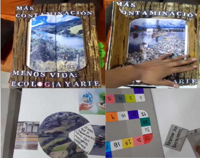Edisson Macancela, Johana Pérez y Jacqueline Urgilés crearon un libro-arte con un sugerente nombre: “Más contaminación, menos vida: ecología y arte” (Figura 5). Este artefacto propone no solo enseñar, sino crear conciencia ambiental. La idea es mostrar realidades distintas, en la mayoría de los casos, entre lo rural y lo urbano. Para ello se tomaron materiales de la misma naturaleza, como cortezas de árboles, para crear la portada y contraportada del libro.