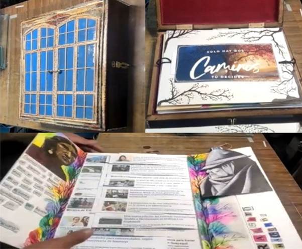 Este libro-arte se presentó en forma de baúl. En su interior se desplegaron una serie de ventanales que al abrirlos iban narrando datos relevantes sobre la educación en el Ecuador. Así pues, este libro, además de ser un objeto artístico, se propuso como mecanismo de expresión y de denuncia de ciertos aspectos económicos, políticos y sociales que repercuten de manera directa y negativa en la comunidad educativa, sobre todo en los sectores más vulnerables/vulnerados de la sociedad.