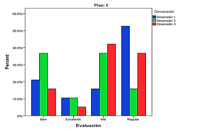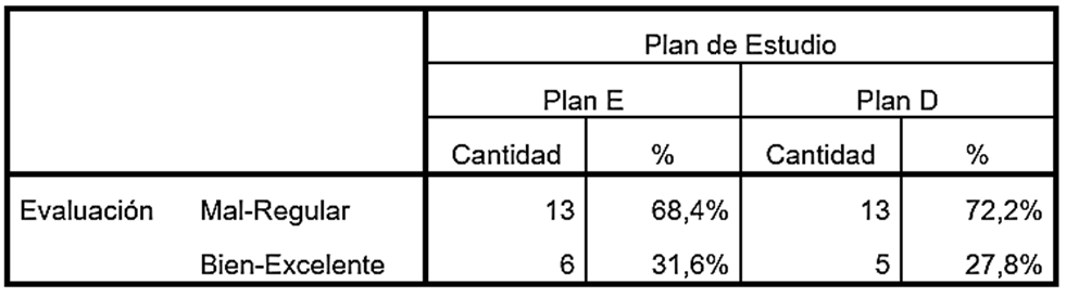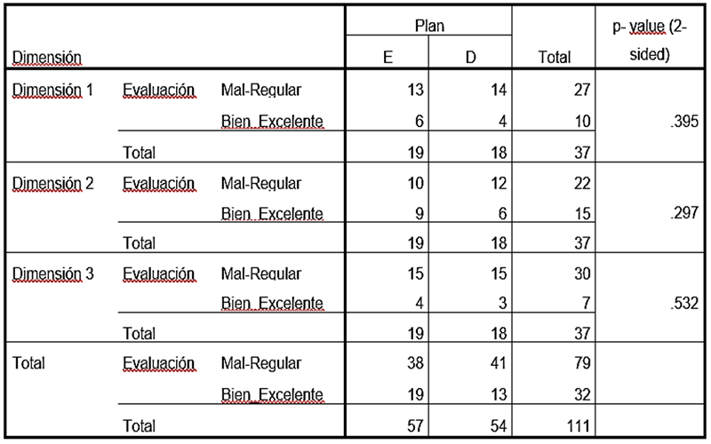 Para analizar el nivel alcanzado por los estudiantes en cada dimensión y compararlos entre los planes de estudio, se recodificó la variable que representa el resultado de cada dimensión utilizando el descriptor dado en la Tabla 1 en dos niveles: Mal-Regular y Bien-Excelente. Los resultados del análisis se muestran en la Tabla 6.