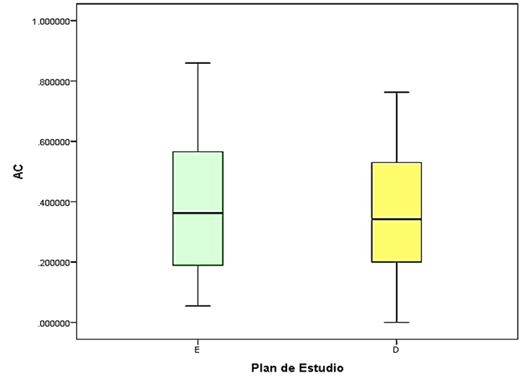 De la tabla 8 se concluye que la hipótesis nula se acepta o sea AC promedio de los estudiantes de los diferentes planes no difieren. Por tanto, la hipótesis 2 no se cumple, o sea, no existen evidencias que el diseño curricular garantice mejores resultados, justificado por los años de estudio de la carrera.