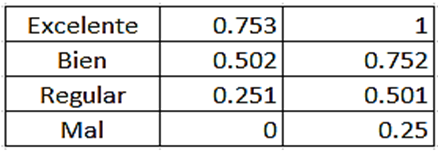 El cuestionario aplicado posee una evaluación cuantitativa obtenida a través de las expresiones 1.1 y 1.2 cuyo resultado se expresa en un número del intervalo del 0 al 1, excepto la última pregunta en la que se pide el relato de su trayectoria en la carrera. Las fórmulas establecidas por Medina et al. (2021) variadas con la expresión 1.3 permiten establecer equivalencias entre los valores del intervalo y el sistema evaluativo en Cuba para la Educación Superior, como se refleja en la Tabla 1: