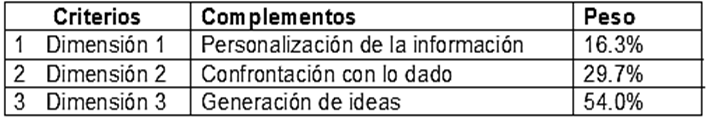 Para determinar el peso de cada dimensión se recomienda el método de comparaciones pareadas que clasifica dentro de los métodos de ponderación subjetivos (Villa-Silva et al., 2019). Los especialistas consultados mostraron sus preferencias por cuantificar la intensidad de cada dimensión utilizando la escala de valoración propuesta por Saaty (1987) y se obtiene la Tabla 2.