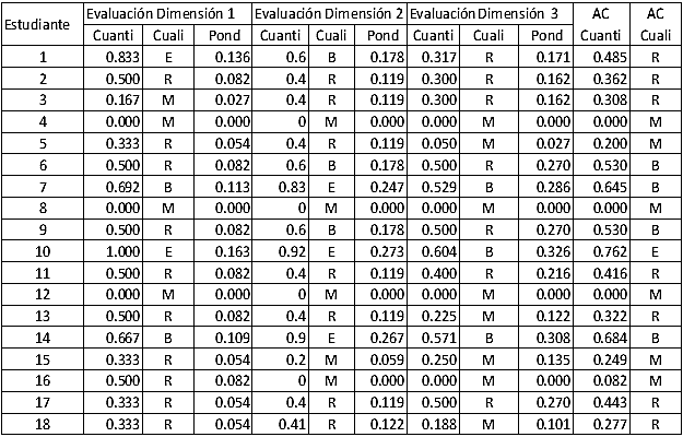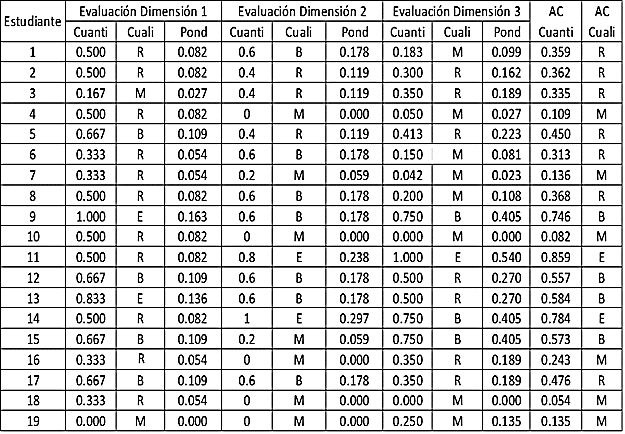 La aplicación de las expresiones 1.1 y 1.2 permitió calcular el AC en los estudiantes de quinto año para determinar la cantidad de estudiantes que se encontraron en cada categoría. Los resultados se muestran en la Tabla 4; siendo M la calificación de Mal, R la calificación de Regular, B la calificación de Bien y E la calificación de Excelente: