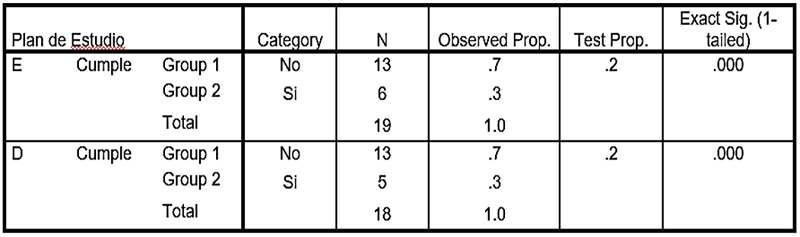 Para probar la hipótesis 1 se aplicó la prueba binomial utilizando el SPSS versión 22, y se obtuvieron los siguientes resultados (Tabla 5):