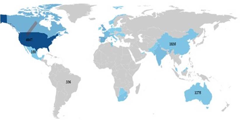 With respect to publications’ geographic distribution, it is important recording that such an information was only available in the database for 97.2% of the sample. Figure 2 shows the amount of scientific production per country. It is possible observing that the highest production rate (black and dark grey) was recorded in the United States (17%), United Kingdom (10.4%), Spain (5.4%) Australia (5.2%) and Canada (4.1%). The lowest rate of it (0.1%) was recorded for countries like Somalia, Syria and Uzbekistan. Brazil accounted for 1.03% of publications in this field within the sample.