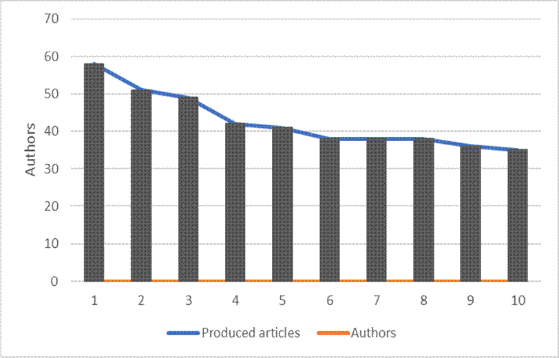 As for measurements on authors’ productivity, Lotka Law features authors’ scientific production as follows: few authors produce a lot and many authors produce a little (Guedes & Borschiver, 2005). Figure 3 shows the number of authors X the number of produced articles, and it confirmed that the reversed J format in the Lotka Law meets the significant drop in standard and tends to be linear with an extensive chain of small producers. The authors standing out for productivity are listed in Table 3.