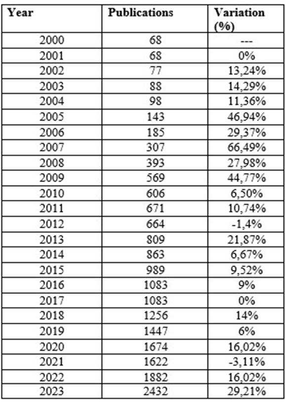 The research between the time period 2000-2023 was careful to include the short pandemic period 2020-2023 because, according to Silveira et al. (2023), the World Health Organization (WHO) declared a state of emergency due to a series of pneumonia cases in the city of Wuhan, China. This author also complemented this topic by describing the SARS-CoV-2 virus as responsible for causing a viral infection transmitted by respiratory droplets.