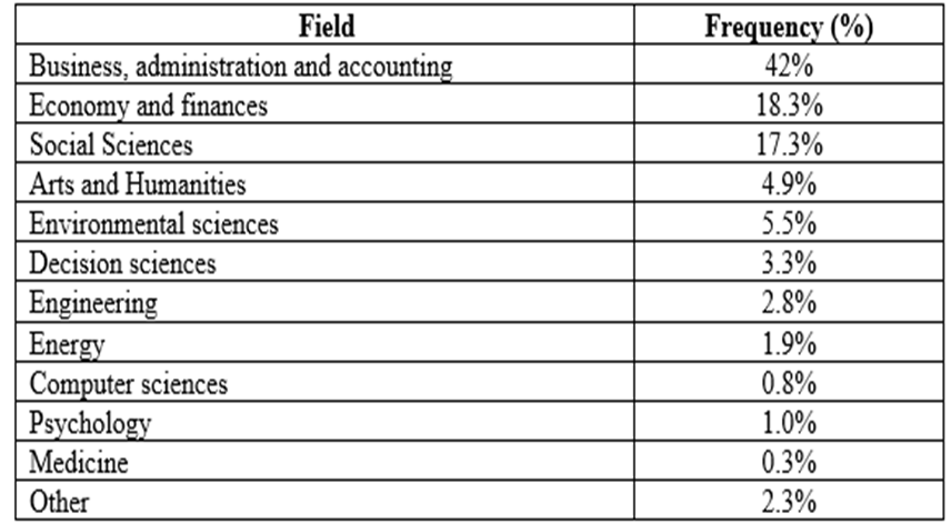 According to Table 2, the total number of published studies in the applied social sciences field recorded the highest rate of publications; it summed 60.3% of the total number of published articles. Business, administration and accounting responded for 43.5% of this total, and economy and finances accounted for 20% of it.