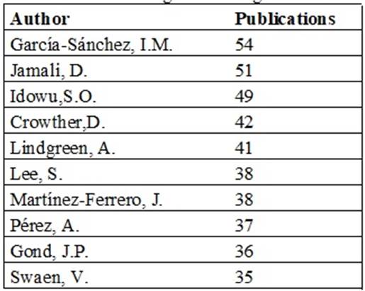 Research results related to the number of publications per author were in compliance with the Lotka Law, which states that few authors publish a lot, and many authors publish a little. It was observed that 65% of authors have published up to 11 studies and only 3% of them published from 31 to 42 studies. García-Sánchez is the most productive one with 54 publications; he was followed by Jamali with 51 publications and by Idowu with 49 publications.