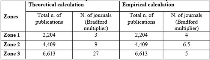 Table 4 presents the comparison between empirical data and theoretical calculation. Based on the recorded data, it is possible observing that none of the zones showed empirical results in compliance with the Bradford Law. This finding can point out that the analyzed field in the journals remains under consolidation process.