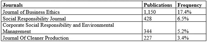 Table 5 shows the journals in the first zone of Bradford. Journal of Business Ethics, Social Responsibility Journal, Corporate Social Responsibility and Environmental Management Journal are among the journals belonging to applied social sciences field with the highest rates of publications in this topic. Except for Journal of Cleaner Production, which belongs to the environmental sciences field.