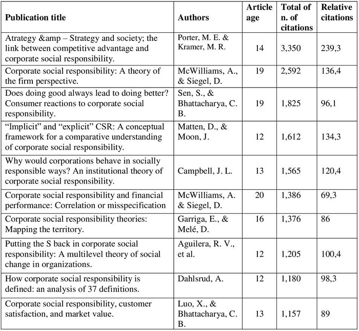 The volume of citations refers to the contribution from the study to the scientific community when it comes to reference terms about topics. A publication is assessed based on the number of times it was cited in other articles (Umbelino, 2008). This process points out that the larger the number of studies referring to the publication, the stronger its impact on the scientific community. The most cited studies allowed observing the relevance of the stakeholders’ theory for the CSR field, since 70% of the studies recording the highest citation indices were related to it.
