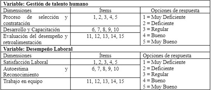 Para la recolección de datos, se utilizó la técnica de la encuesta a través de la distribución de dos cuestionarios ad hoc que presentaban escalas de tipo Likert, uno para medir la GTH y otro para el DL. El cuestionario de GTH se fundamentó en tres aspectos: a) Proceso de selección y contratación, b) Desarrollo y Capacitación y c) Evaluación del desempeño y Retroalimentación, con un total de 15 ítems. El de DL igualmente se basó en tres dimensiones: a) Satisfacción Laboral, b) Autoestima y Reconocimiento y c) Trabajo en equipo, con otros 15 ítems.