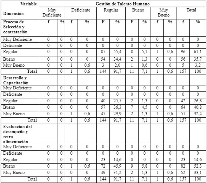 En cuanto a la variable GTH, se aprecia que el 91,7 % de los empleados la distingue como regular, lo que sugiere que hay una percepción de insuficiencia o deficiencia en las políticas y prácticas relacionadas con el manejo del capital humano. Esto puede afectar negativamente el entorno laboral, el estímulo y la dedicación de los trabajadores, así como su desempeño y desarrollo profesional. Por lo tanto, se recomienda que las asociaciones sociales privadas revisen y fortalezcan sus procesos de GTH, tales como la selección, la capacitación, la remuneración y el desarrollo de carrera.