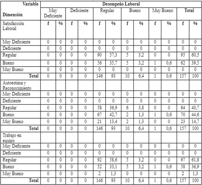Asimismo, se observa una correlación entre la valoración del trabajo en equipo y la evaluación del DL, ya que el 93 % de los trabajadores que consideran Regular el trabajo en equipo también consideran Regular el desempeño laboral. Esto permite exteriorizar que hay una percepción generalizada de que la organización no está brindando las condiciones adecuadas para fomentar el trabajo en equipo, tales como capacitación, incentivos, comunicación, retroalimentación, entre otros.