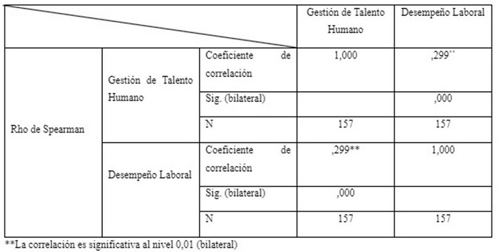 Los resultados arrojan luz sobre una correlación significativa entre la gestión de talento humano y el desempeño laboral. Específicamente, se revela una conexión concreta respaldada por un coeficiente de correlación de Spearman de 0,299 (p=0.000), lo que evidencia la influencia directa de la gestión de talento humano en el desempeño laboral.