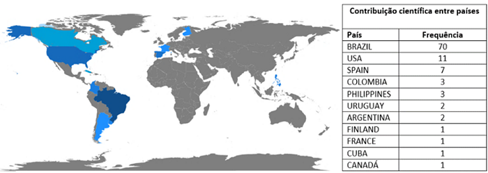 No que se refere a contribuição entre países, tem-se abaixo a Figura 1 gerada pelo programa Bibliometrix, percebe-se que o país que aparece com maior frequência nos artigos é o Brasil, seguido de Estados Unidos e Espanha.