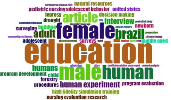Dentre as palavras mais usadas dentro dos artigos se destacam educação, mulher, homem, humano, artigo, Brasil, adulto, experiência humana, entrevista. Como programa Bibliometrix foi possível criar a nuvem de palavras da representada na Figura 2.