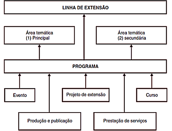 . (Forproex, 2007, p. 12)Em geral, as atividades de extensão podem ter duas áreas, conforme o esquema a seguir, (Figura 3): uma principal e/ou outra secundária. Mas, necessariamente precisam ter um programa que pode ser estendido através de um evento, ou produto, ou projeto de extensão, ou prestação de serviço ou curso.