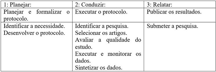 Tendo em vista as ações sobre a extensão universitária obrigatória voltada para a educação básica como recurso para atingir as metas do Plano Nacional de Educação (PNE), na Tabela 1 apresentam-se as três fases da aplicação desse método de pesquisa RBS, que consiste em planejar, conduzir e relatar; e que, sob as diretrizes de Kitchenham (2004), apresenta a revisão sistemática como ferramenta científica, identificadora e avaliativa de pesquisas disponíveis e que sejam relevantes para uma determinada questão de pesquisa.