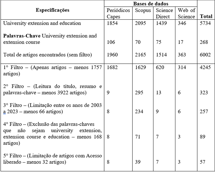 Para realizar as consultas, foi construída uma estratégia de busca (strings) que seguiu um processo de seleção por meio de testes de combinação de palavras e de utilização de operadores lógicos de busca booleana. A partir de uma revisão bibliográfica preliminar, sem o rigor de uma revisão sistemática, foram identificadas as palavras-chave que caracterizam o tema investigado, sendo “University Extension” o principal termo de busca, acompanhado de “education” pelo booleano AND e, posteriormente, o termo principal acompanhado de “extension course”, também pelo booleano AND. As palavras-chave de busca foram utilizadas na língua inglesa pelo fato de que as publicações, mesmo de outro idioma, são indexadas por palavras-chave e resumos na língua inglesa e por ser um idioma considerado como universal.