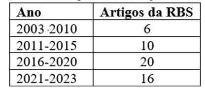 Ao se considerarem as 52 publicações selecionadas pela RBS pôde-se constatar que 69,23% de produção concentraram nos últimos sete anos (2016-2023) (Tabela 3)