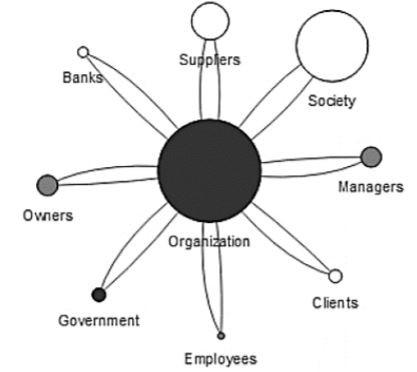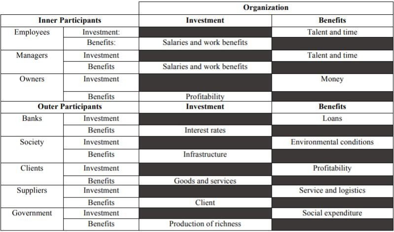 If we take into account that stakeholders that are usually mentioned in the bibliography, it is possible to identify a constant contact among stakeholders that could redefine the concept of organization as a steady interaction among stakeholders to obtain a specific benefit that is the most desirable and possible outcome compared to the investment made, in short, it represents a valuation between what does the participant do and the quality of the return obtained.