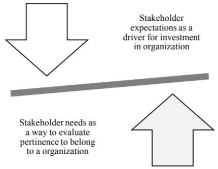 The focus of this work is to understand that the analysis of the relationship between investment and benefit can explain the reasons why some stakeholders stay in interaction with an organization and some others do not, where the shared benefit is perceived as equilibrated among interests, the relation continues, while a change in that balance can affect the relationship and even terminate it.