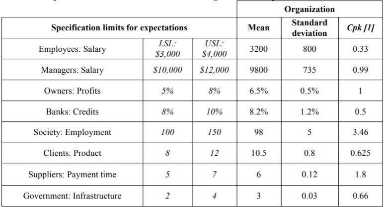An organization that identifies relevant participant as ultimate stakeholders could make use of data and different kind of surveys to determine the expectations of those actors in terms of quantitative limits or “lower and upper specification limits” (LSL and USL) and apply cpk calculation according to [1].