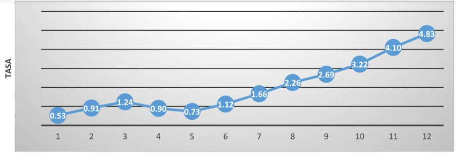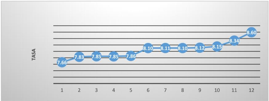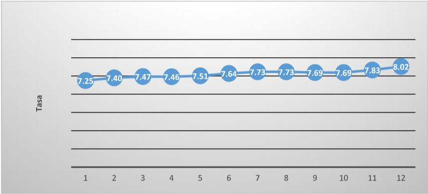 Fuente: Elaboración propia con cifras proporcionadas por el Banco de México e Instituto Nacional de Geografía y Estadística (2018). http://www.inegi.org.mx/sistemas/bie/ (consultado en enero 10 de 2019) Ruta temática: Financiero y bursátil > Indicadores financieros y bursátiles > Tasas de interés bancarias > Tasa de interés interbancaria de equilibrio (TIIE) >A 28 días (al cierre del mes)5. TASA DE RENDIMIENTO DE LOS CETES