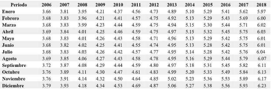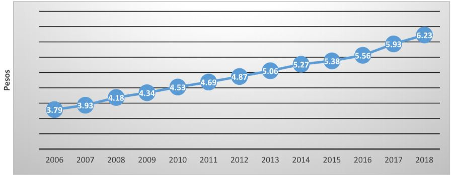 Fuente: Elaboración propia con cifras proporcionadas por el Banco de México e Instituto Nacional de Geografía y Estadística (2018). http://www.inegi.org.mx/sistemas/bie/ (consultado en enero 10 de 2019) Ruta temática: Indicadores económicos de coyuntura > Indicadores financieros > Tipo de cambio del peso respecto al dólar y valor de las UDIS > Valor de las unidades de inversión (UDIS)