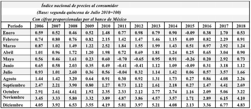 Nacen en 1995 y reflejan los cambios en los precios al consumidor, mide el aumento general de precios en el país. Se calcula quincenalmente por el Banco de México y la participación del INEGI, se publica en el Diario Oficial de la Federación los días 10 y 25 de cada mes. El periodo de referencia es la segunda quincena de diciembre de 2018.
