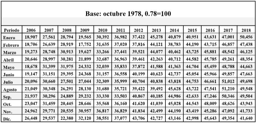Fuente: Elaboración propia con cifras proporcionadas por el Bolsa Mexicana de Valores e Instituto Nacional de Geografía y Estadística (2018). http://www.inegi.org.mx/sistemas/bie/ (consultado en enero 10 de 2019) Ruta temática: Financiero y bursátil > Indicadores financieros y bursátiles > Índice de precios y cotizaciones de la Bolsa Mexicana de Valores > Último índice del mes