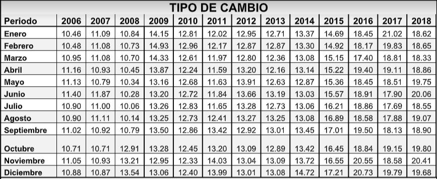 Fuente: Elaboración propia con cifras proporcionadas por el Banco de México e Instituto Nacional de Geografía y Estadística (2018). http://www.inegi.org.mx/sistemas/bie/ (consultado en enero 10 de 2019) Ruta temática: Financiero y bursátil > Indicadores financieros y bursátiles > Cotización del dólar en el mercado cambiario nacional > Tipo de cambio para solventar obligaciones en moneda extranjera > Cotizaciones al cierre del mes. Venta