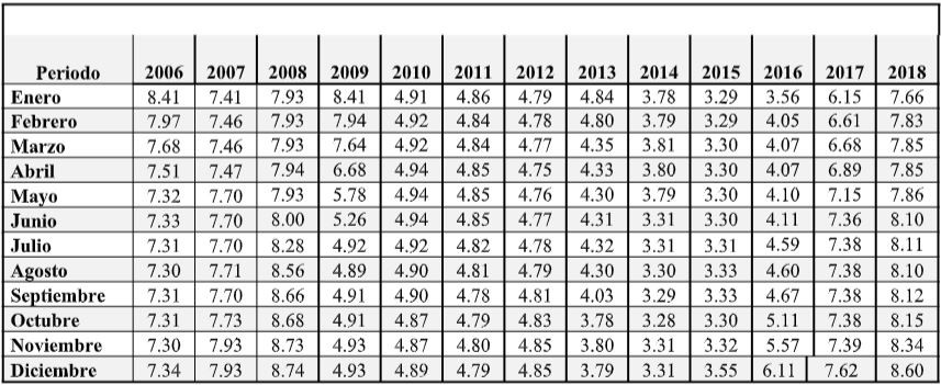 Fuente: Elaboración propia con cifras proporcionadas por el Banco de México e Instituto Nacional de Geografía y Estadística (2018). http://www.inegi.org.mx/sistemas/bie/ (consultado en enero 10 de 2019) Ruta temática: Financiero y bursátil > Indicadores financieros y bursátiles > Cotización del dólar en el mercado cambiario nacional > Tipo de cambio para solventar obligaciones en moneda extranjera > Cotizaciones al cierre del mes. Venta4. TASA DE INTERÉS INTERBANCARIA DE EQUILIBRIO (TIIE).