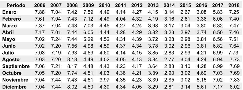 Fuente: Elaboración propia con cifras proporcionadas por el Banco de México e Instituto Nacional de Geografía y Estadística (2018). http://www.inegi.org.mx/sistemas/bie/ (consultado en enero 10 de 2019) Ruta temática: Indicadores económicos de coyuntura > índice de precios > Índice nacional de precios al consumidor >Mensual > Índice > Índice general